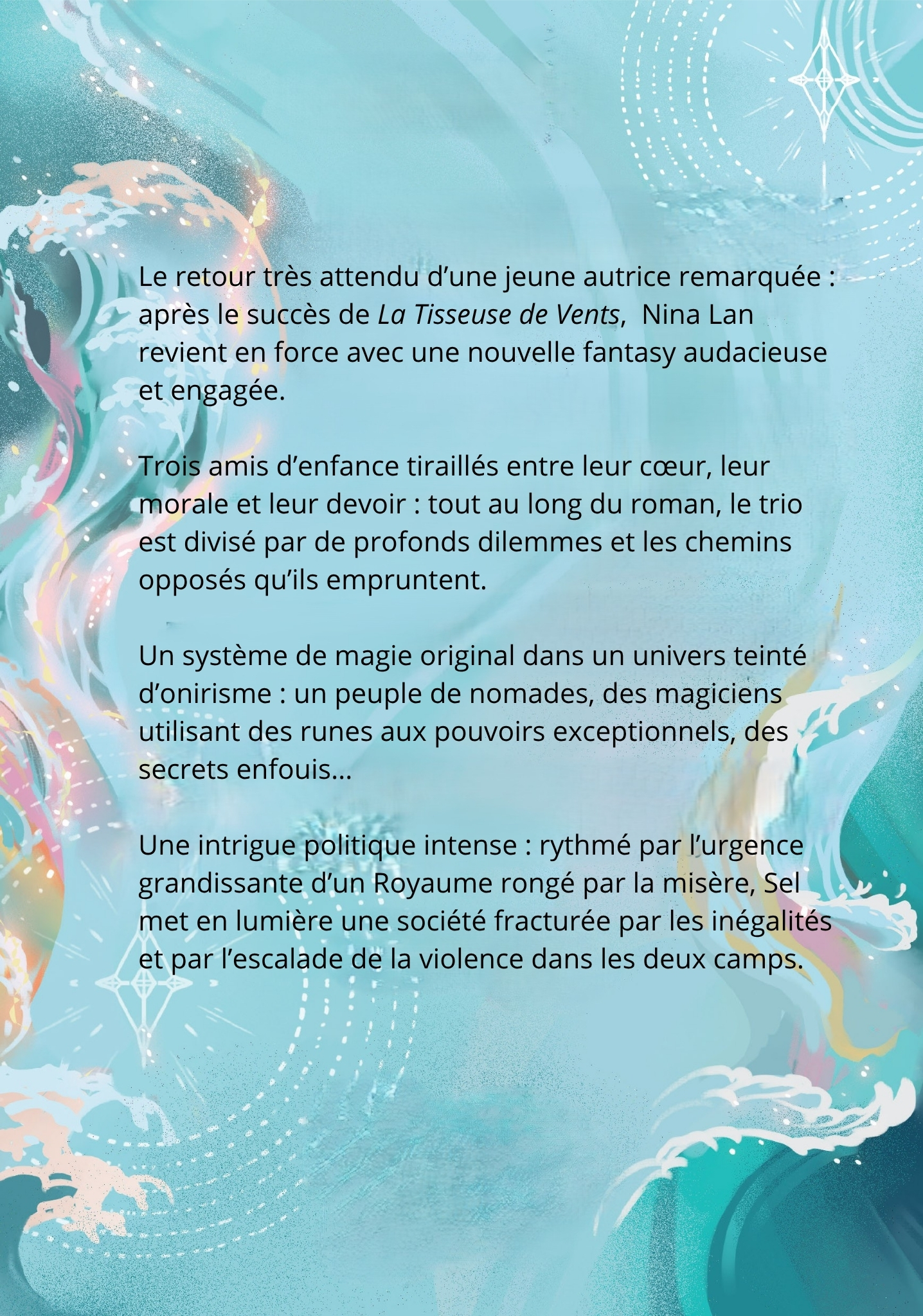 Nami, fille du peuple des Mouvants, a le Sel dans le sang. Cette année, elle guidera la caravane de son clan vers les salines de Perlevent. Son rêve se réalise et avec lui, surtout, l’espoir de retrouver Calist et Élian, ses amis de toujours.
